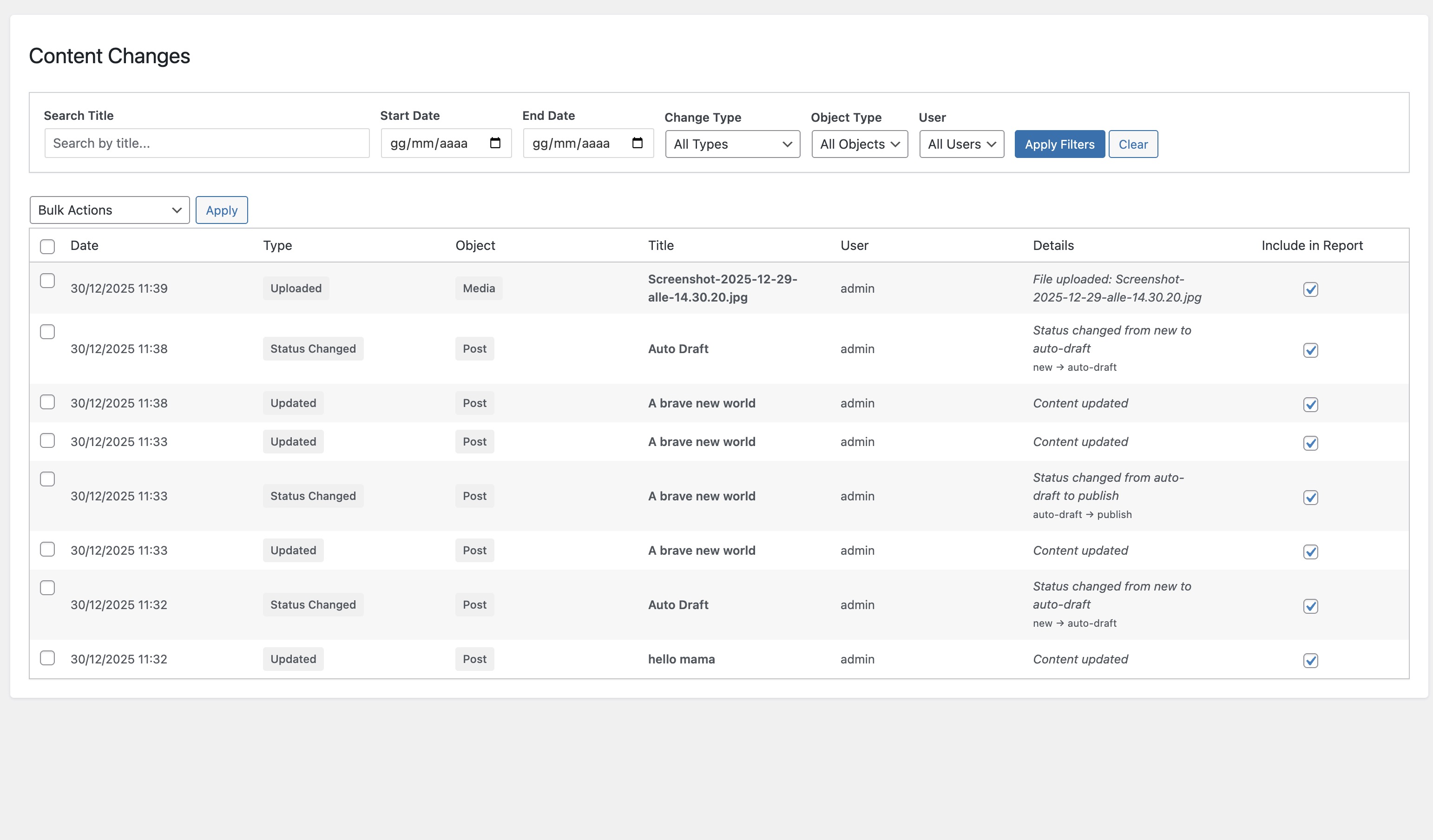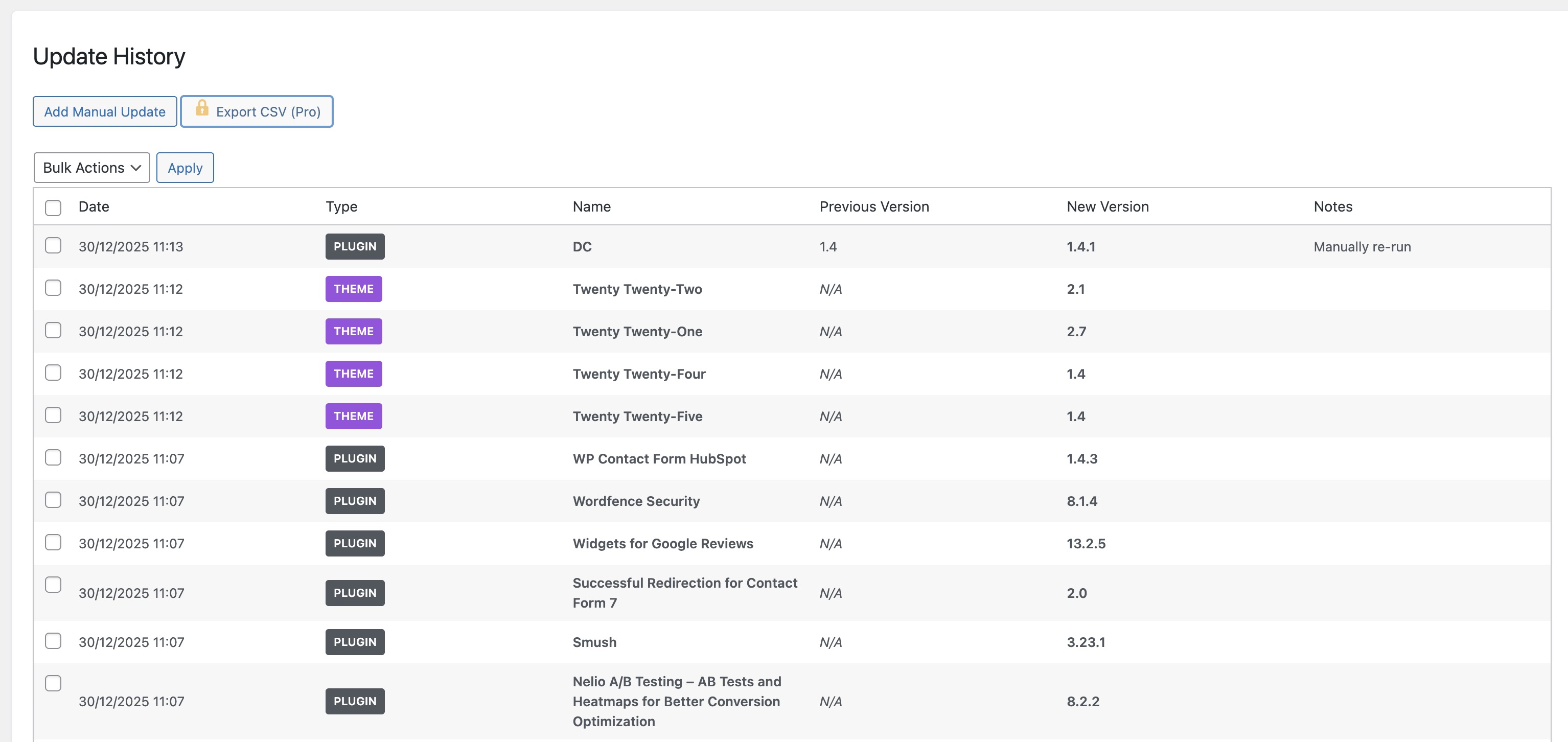 Every core, plugin, and theme update logged automatically
