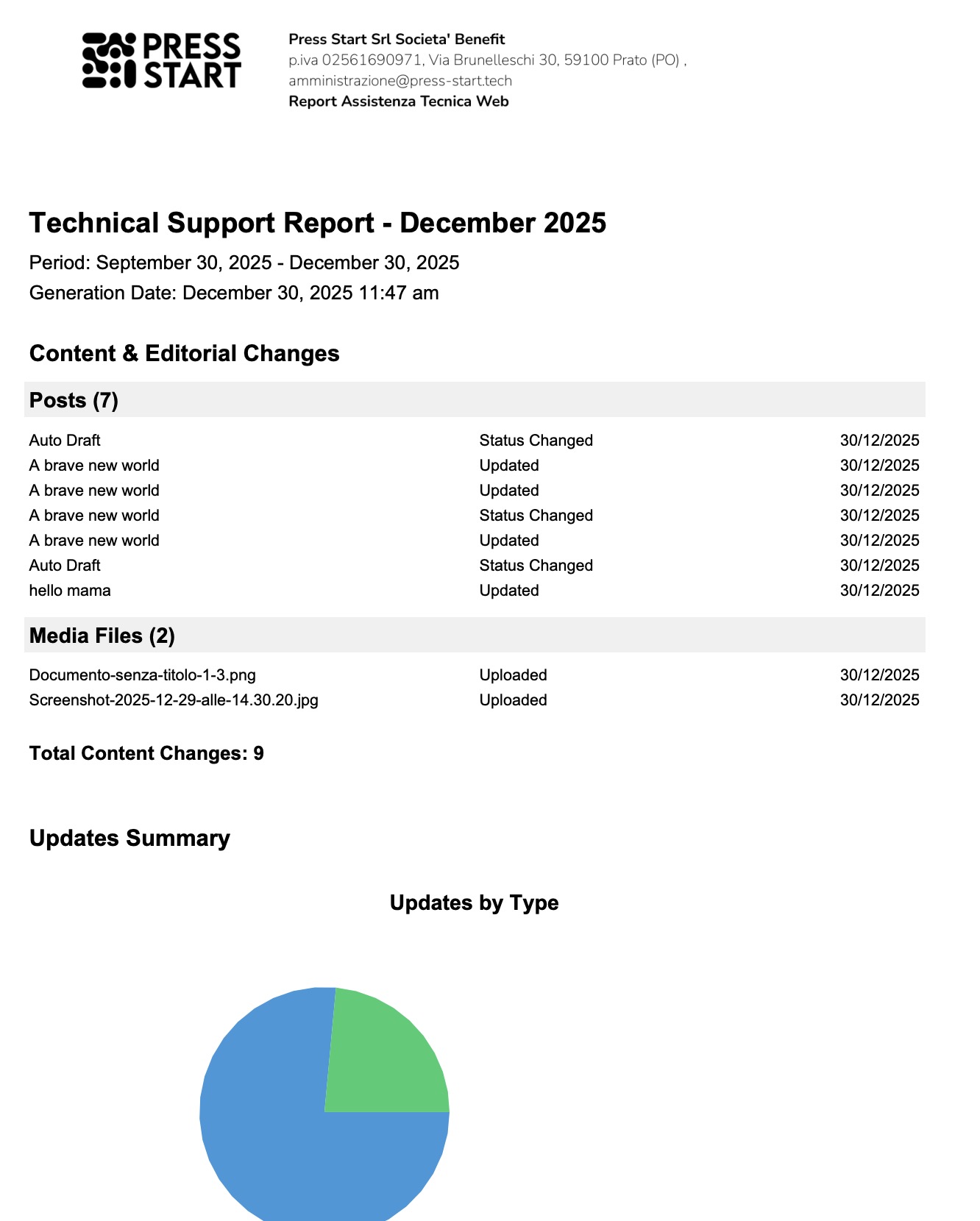 Every WordPress update logged. Every content change tracked with user accountability. Professional branded reports generated in one click.
